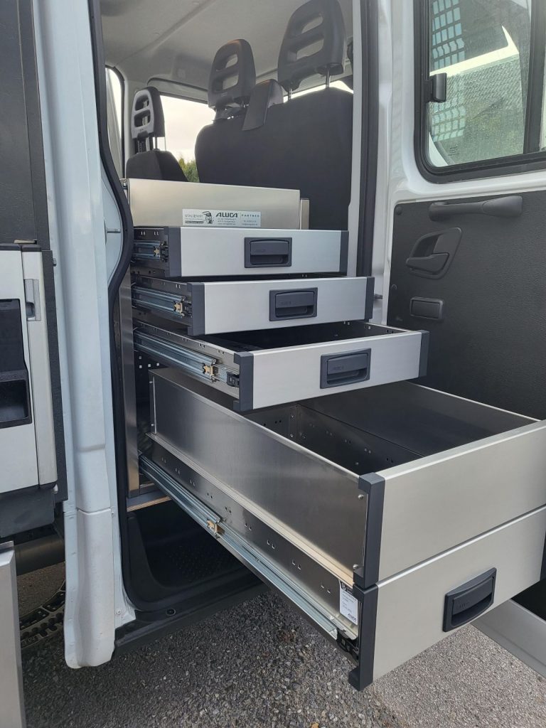 Dieser MAN TGE dient als Werkstattwagen. Da der Kunde bei seinen Einsätzen bis in die Werkhallen seiner Kunden vorfährt, wünschte er sich von außen bedienbare Schubläden. Kein Problem mit dem ALUCA Unterflurschubladensystem „Dimension2“. Hier ist eine Schubladenhöhe von bis zu 450mm Höhe möglich, also Werkzeugkoffer hochkant in die Schublade stellen. Häufig genutztes Werkzeug vorne, weniger […]