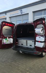 Dieser MAN TGE dient als Werkstattwagen. Da der Kunde bei seinen Einsätzen bis in die Werkhallen seiner Kunden vorfährt, wünschte er sich von außen bedienbare Schubläden.